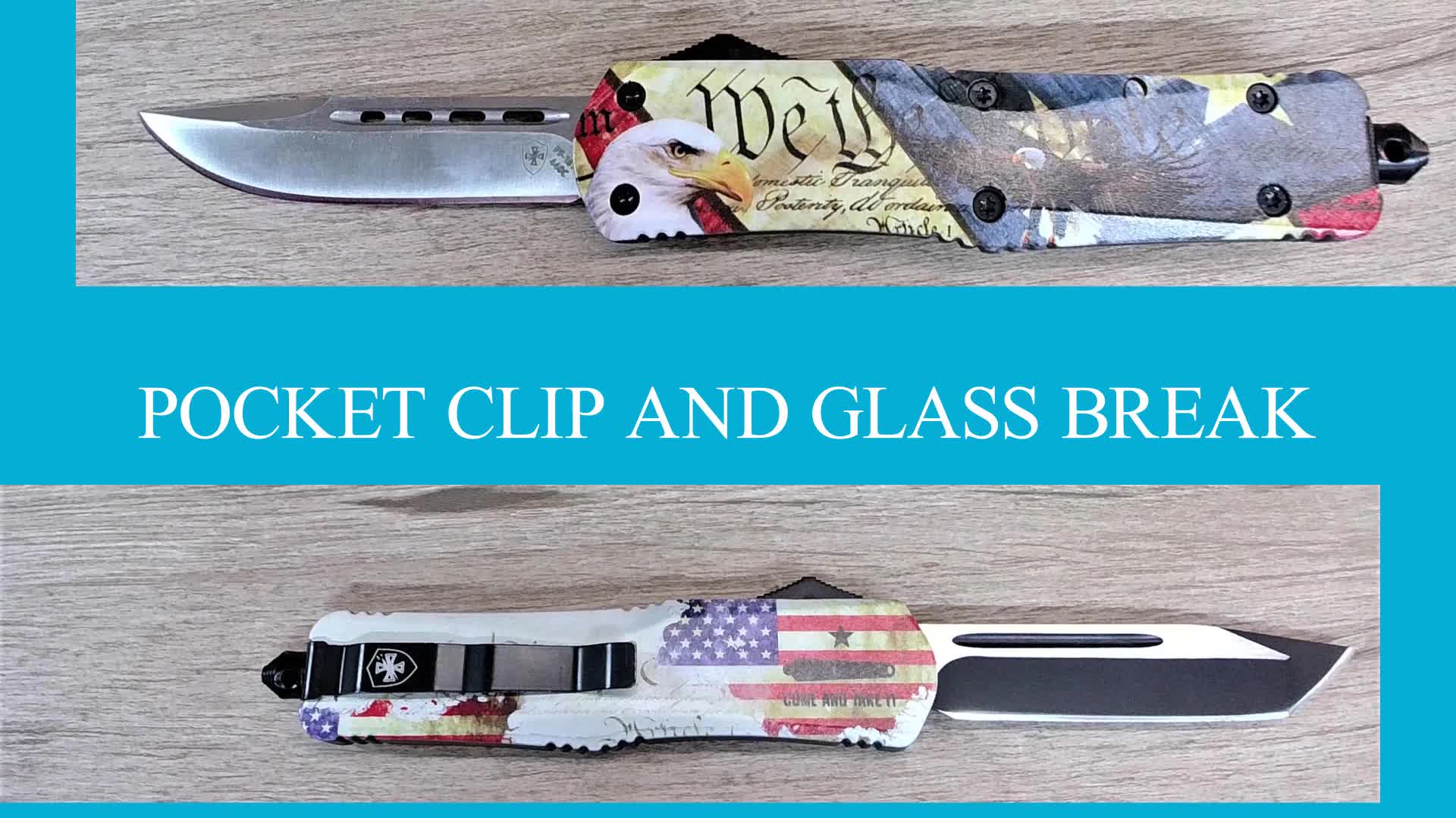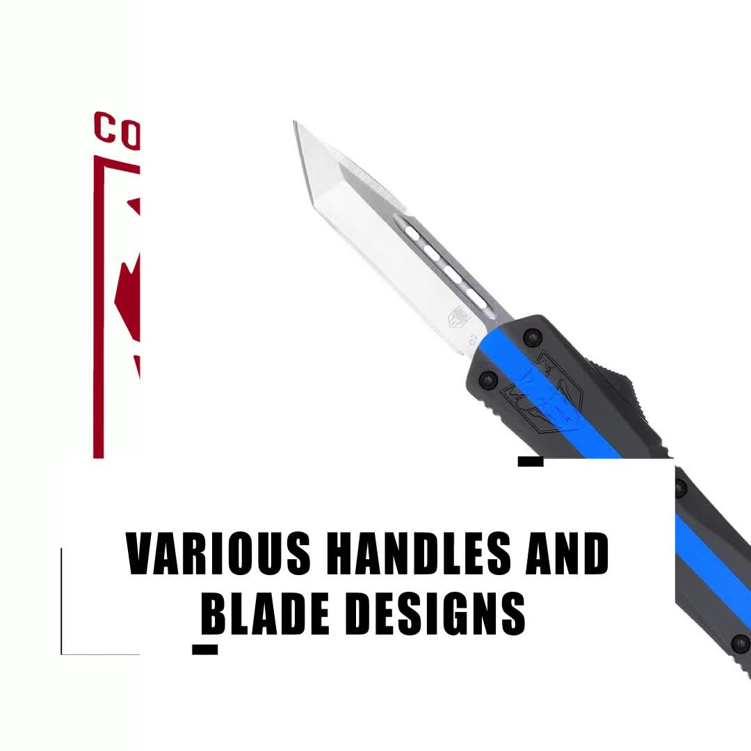 Cobratec out the front knives comes in various handles and blade styles. Comes with lifetime warranty , sheath, and hard shell case. Features D2 steel blades, pocket clip and glass break on most models.