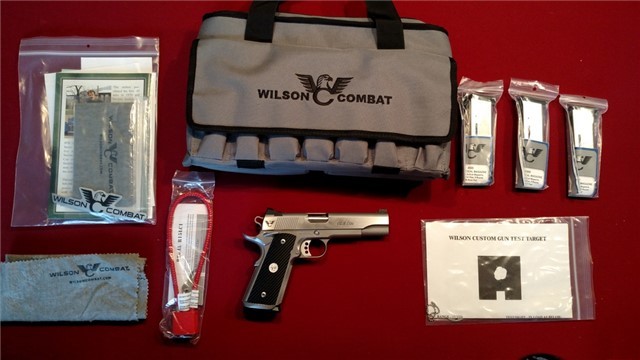 New and unfired Wilson Combat CQB Elite includes, Stainless Steel, Bushingless Bull Barrel, Flush Cut and Reverse Crown Barrel, Bulletproof Ambi Safety, Countersink and Flush Cut Slide Stop Pin, Full Length Guide Rod, Sterling Silver Grip Medalions, Hex Head Grip Screws, Bold Script in lieu of Block Letters on Slide, 2 Additional Wilson ETM Magazines for a total of 4. Also includes everything that came from Wilson including Range Bag Gun Lock Build Sheet Test Target Paperwork and Manuals.