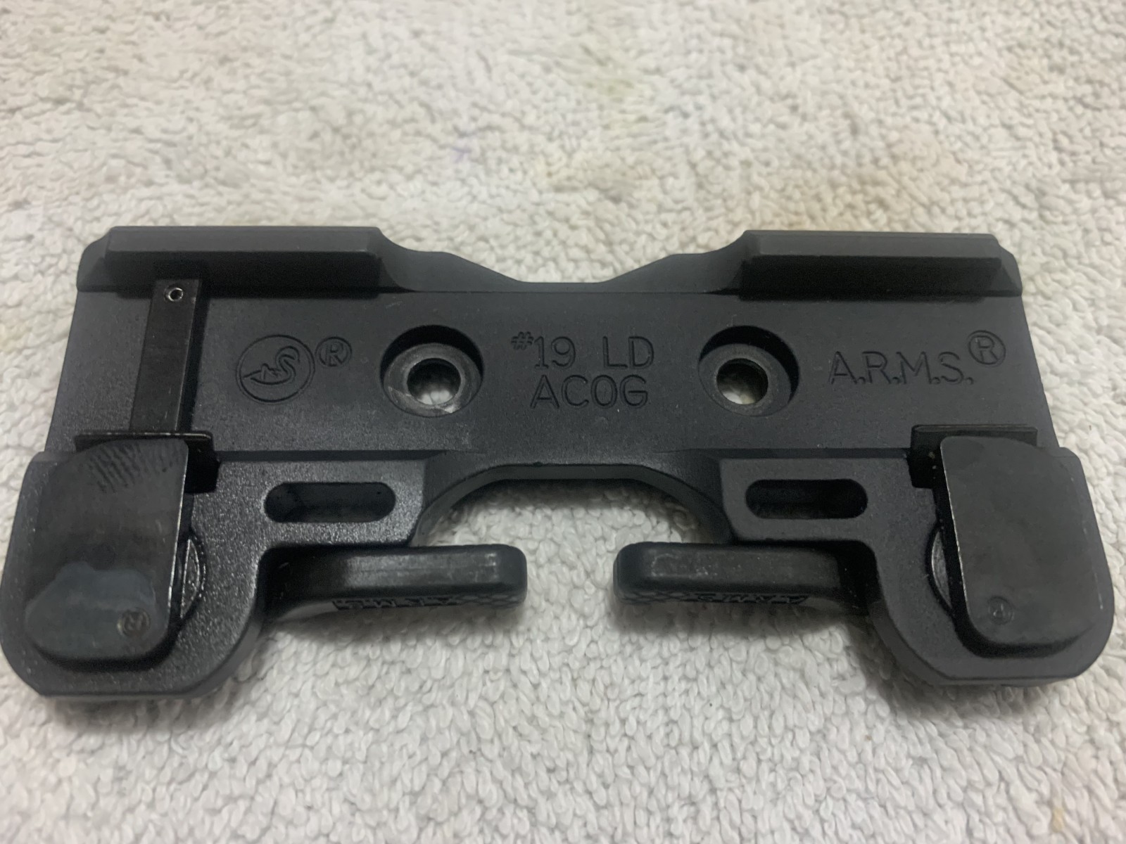 USED CLEAN A.R.M.S.® Low Dual Throw Lever® mount for the Trijicon® ACOG®.quick detach mount raises the ACOG by only approx. 3/16″ off the top of your rail. The mount is approx. 3 3/4″ long to use up as little rail space as possible.