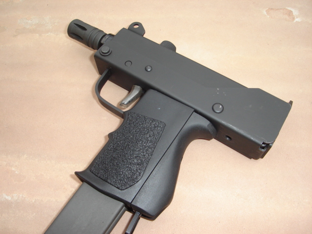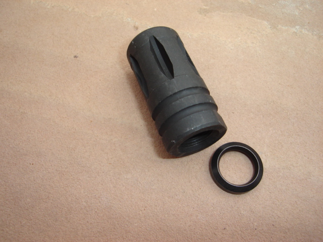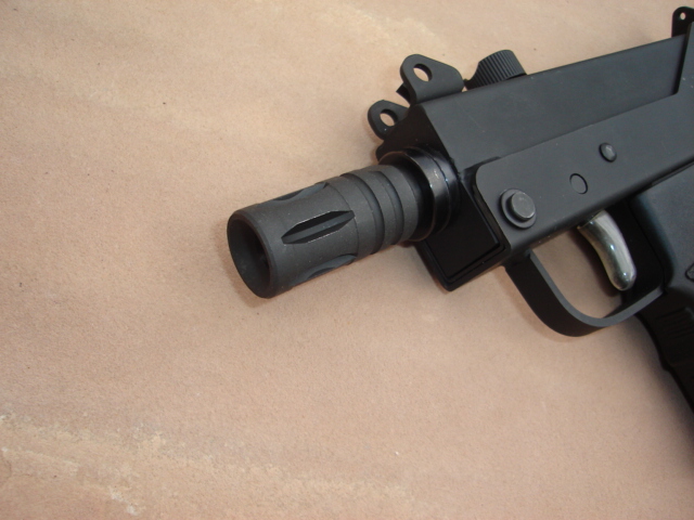 This mini, machined thread protector, is nearly 1.75" inches in length and bored out to accommodate the 9mm rounds. It has cuts in it similar to an A1 muzzle brake but they are not cut through to the bore. Complete with AR crush washer to prevent it from unscrewing under fire. (gun and other parts sold separately)